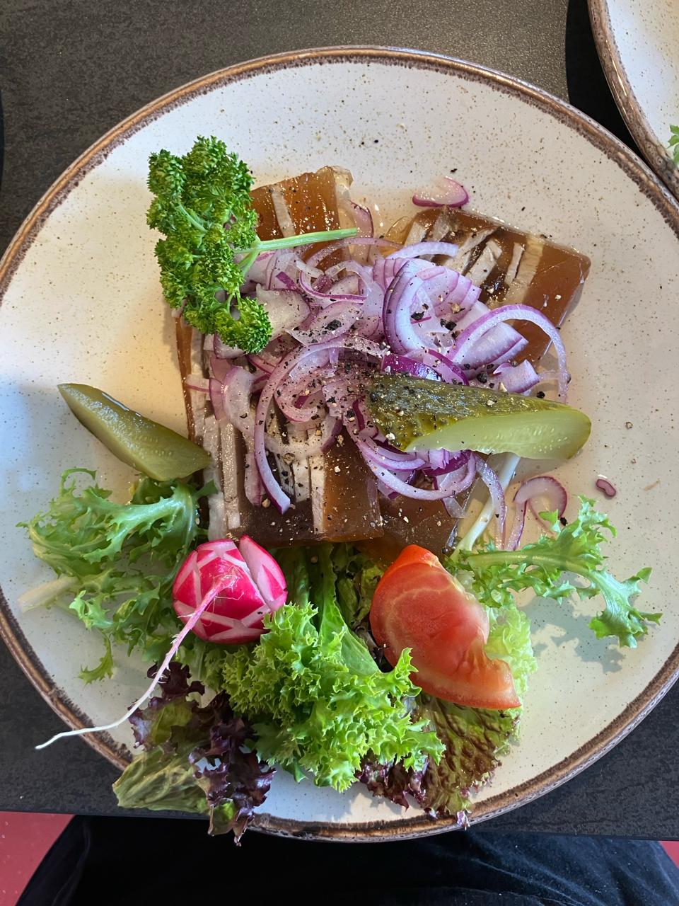 Hausgemacht mit Zwiebeln, dazu Brot und Garnitur